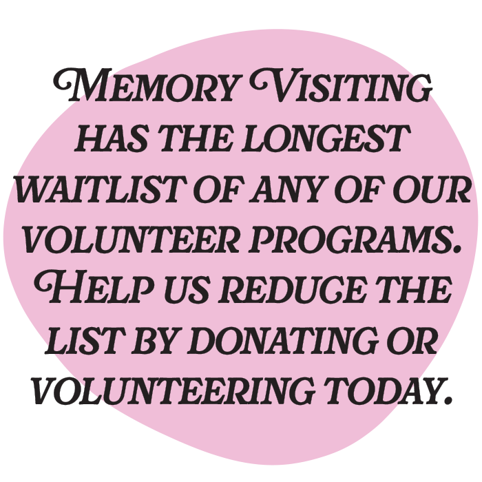 Intrigued by the Memory Visiting program, Ken and Charlene connected with Fiona, a Care Manager. Fiona’s passion and dedication were contagious. Ken explains, “we were shocked by the urgent need for volunteers.” Ken and Charlene knew they had found the perfect opportunity to make a difference.
